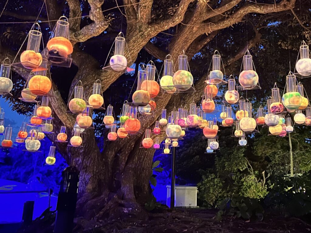 大きな木に、色とりどりのキャンドルが、風に揺られてふわふわと漂っています。