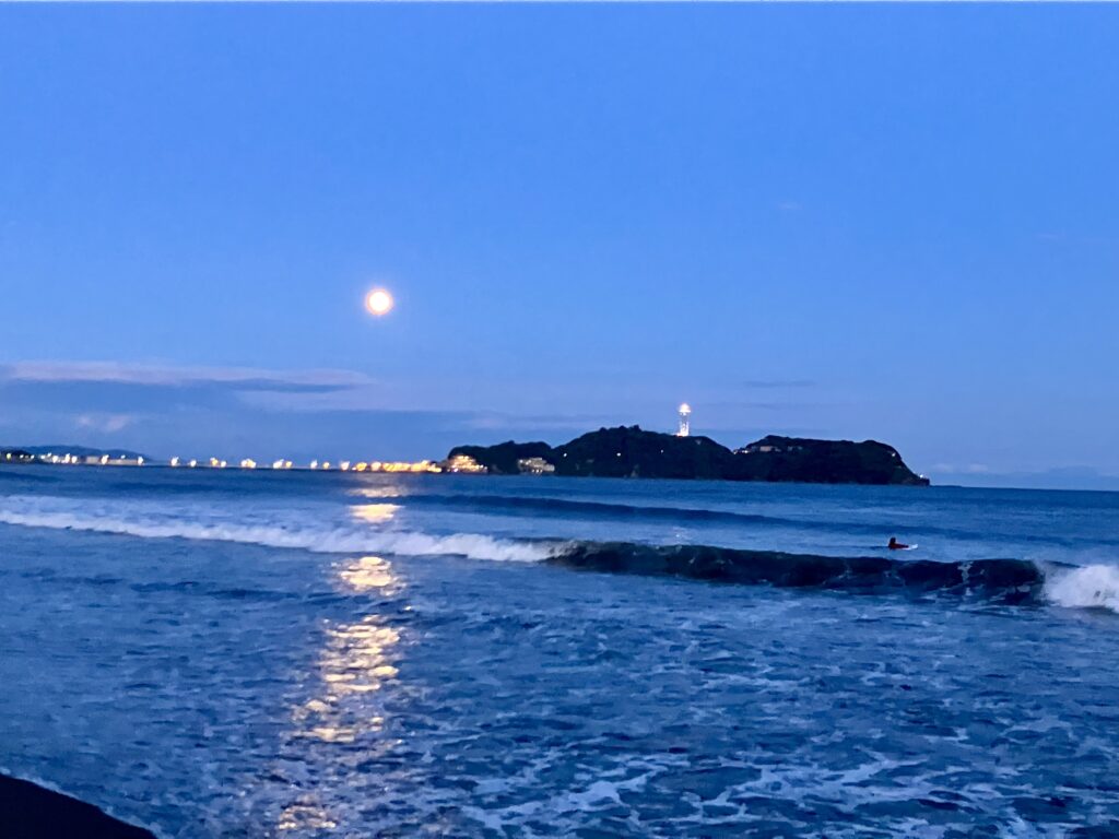 海に照らされた満月と江の島