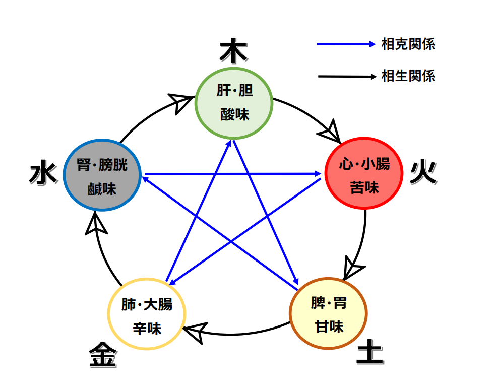 酸味:肝・胆」「苦味:心・小腸」「甘味:脾・胃」「辛味:肺・大腸」「鹹味(かんみ):腎・膀胱