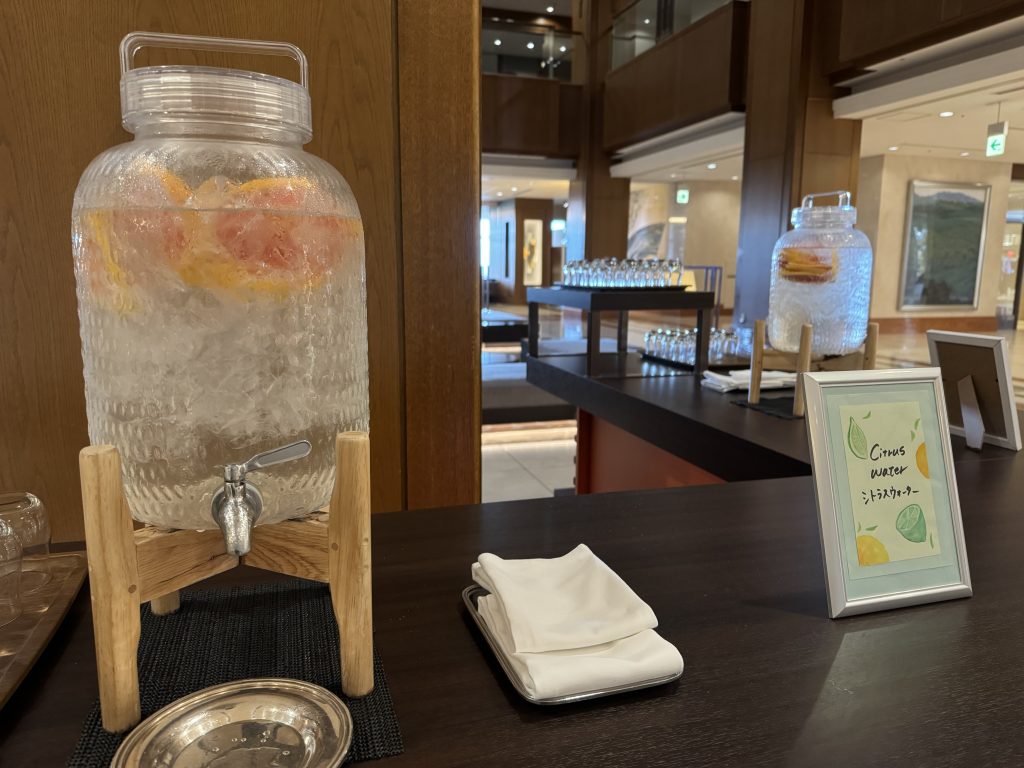 着いて早々に、ロビーに置かれたデトックスウォーターをゴクリ。爽やかなシトラス風味でリフレッシュ効果大◎