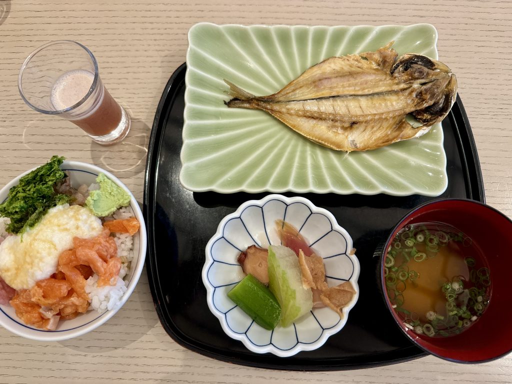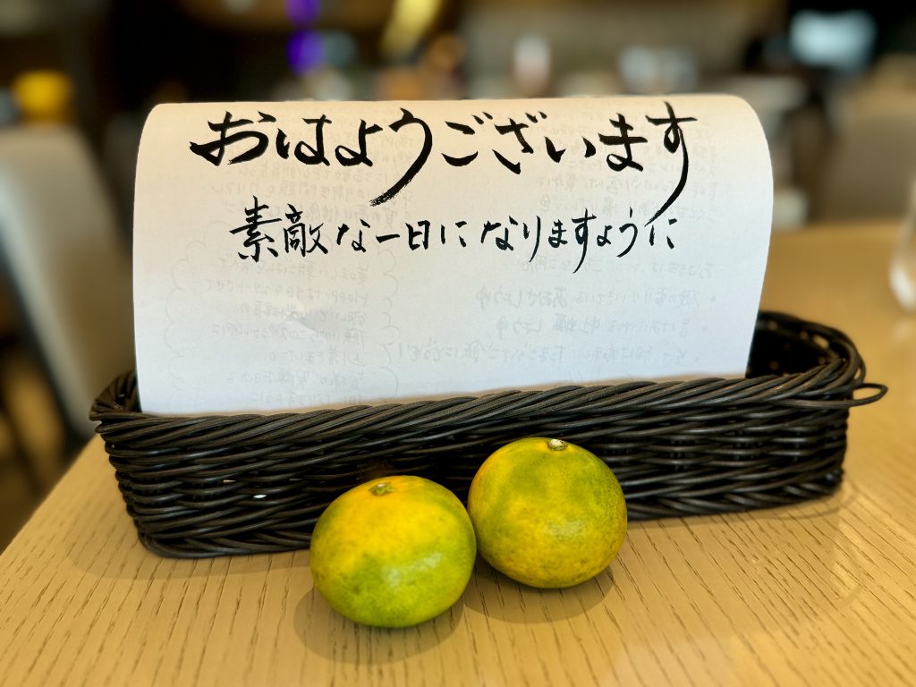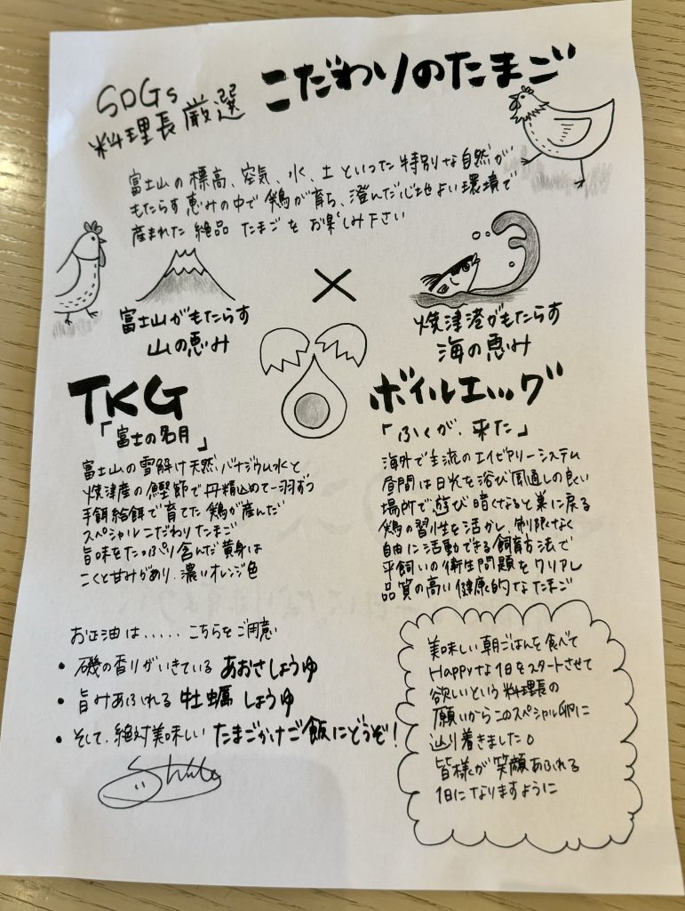 こだわりTKG(卵かけごはん)は至福の朝食メニューですが、地産地消をテーマに小田原産の野菜や果物、鯵の干物や梅干しをいただけるのがモーニングビュッフェの嬉しいポイントでした。
