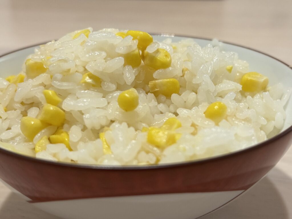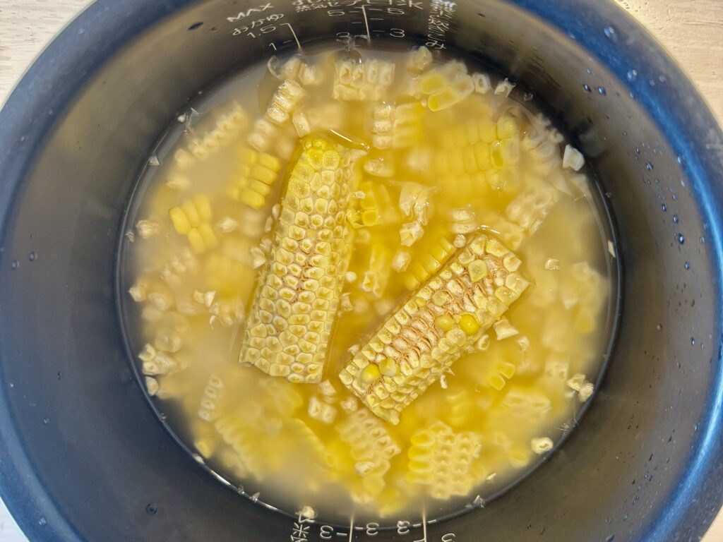 先日、旬のトウモロコシがスーパーで安く手に入ったので♪炊飯器でトウモロコシご飯を炊きました。